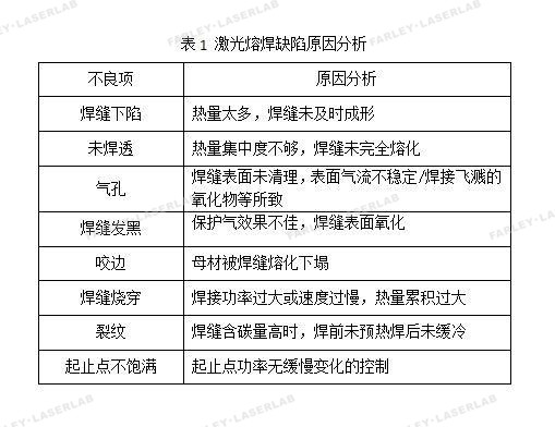 激光熔焊缺陷包括:焊穿、未焊透、表面裂紋、氣孔、咬邊、表面氧化、焊縫下陷等,其原因分析如下表1。