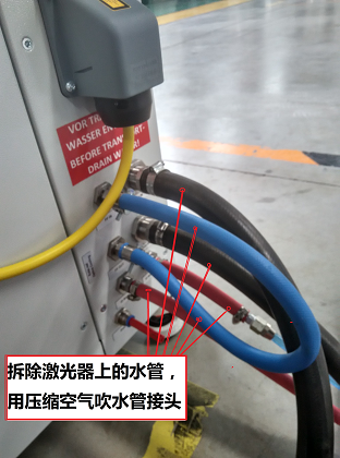 4、將激光器端進出水口的水管拆下來,使用<0.4MPa壓縮氣體分別對6個進出水口進行通氣,直到將激光器內(nèi)部水路里的水吹完為止。